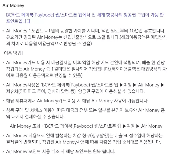 참고로 에어머니(Air Money)는 전 세계 항공권 구입이 가능한 포인트로써 BC카드 페이북 앱을 통해 사용 및 조회가 가능합니다.