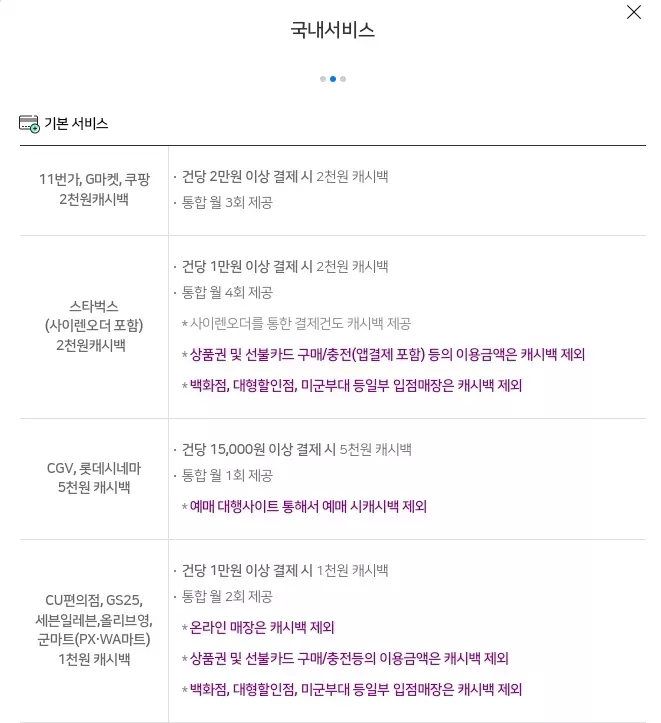 따라서, 카드 사용 및 할인혜택 적용 시 결제 건 별로 적용받고자 하는 혜택의 최소결제금액을 충족하는지 여부를 고려하여야 합니다.